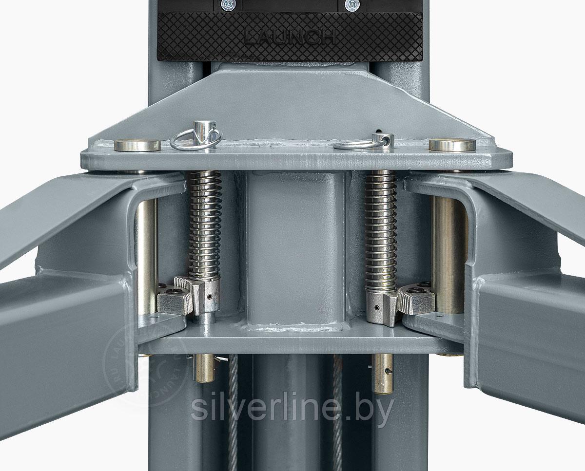 Управление стопорами с одной колонны при помощи автоматизированного пульта управления. Расположение гидростанции в верхней части колонны. Универсальные лапы подхвата (длина передних – до 1120 мм, задних - 1365 мм). Двойной защитный трап. Усиленная конструкция элементов подъемника, шкивы увеличенного диаметра. Толщина металла профиля стойки – 6 мм (на 20-25% больше в сравнении с большинством аналогичных производителей) – придает особенную жесткость и устойчивость колонн подъемника. Элементы защиты в базовом комплекте поставки (гидравлические парашютные клапаны, защита движущихся механизмов, защитные рамки на лапах подхвата, резиновые накладки по всей высоте каретки). Высота подхвата от 110 мм (двухсекционная винтовая регулировка для увеличения высоты подхвата, опциональные удлинители и П-образные подхваты). Максимальная высота подъема – до 1920 мм. Профессиональный Н-образный форм-фактор каретки.