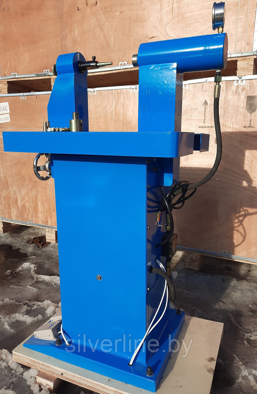 Нажимая ногой на педаль подачи воздуха стенд опускает шток тем самым прижимает клепку к наковальне;