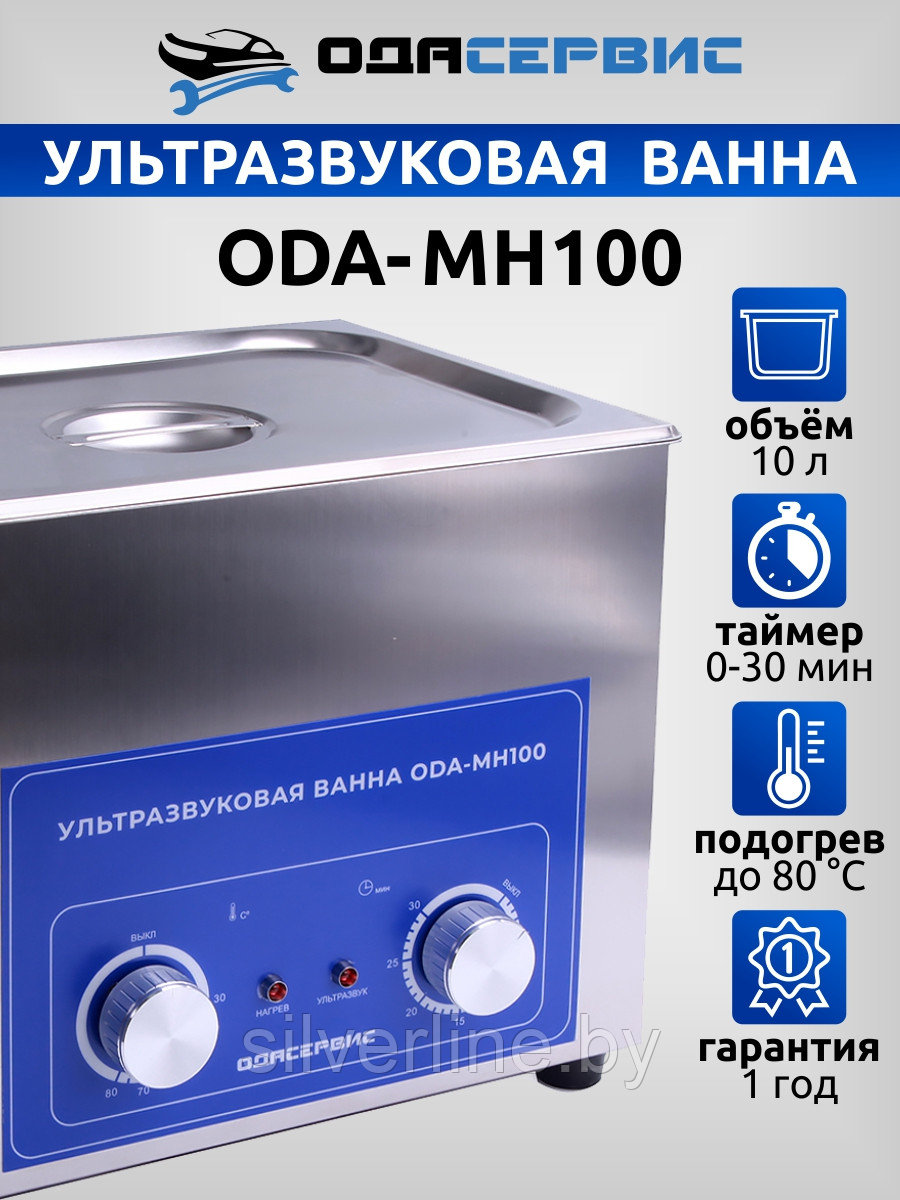 ODA-MH100 – ультразвуковая ванна объемом 10 литров с аналоговым управлением. Оснащена механическим таймером до 30 минут и подогревом до 80°С. Ванна и корзина сделаны из нержавеющей стали SUS304. Имеет частоту ультразвука 40кГц. Подходит для очистки маслянистых, смолистых, жировых и карбоновых отложений. Также возможно использование для стерилизации различных предметов.