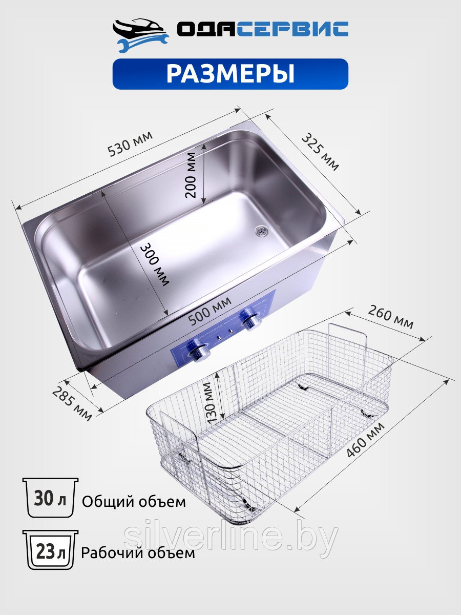 *Обратите внимание: объем ванны указанный в Наименовании, заводом изготовителем, рассчитывается по формуле ДхШхГ, где Д (длина) и Ш (ширина) измеряются по верхней внутренней границе бака, Г ( глубина) максимальное расстояние от верхней кромки бака до его дна. Реальный объем ванны в литрах, отличаться от заявленного, т.к. конструкция бака конусообразная. При выборе ультразвуковой ванны ориентируйтесь на ее рабочий объем.